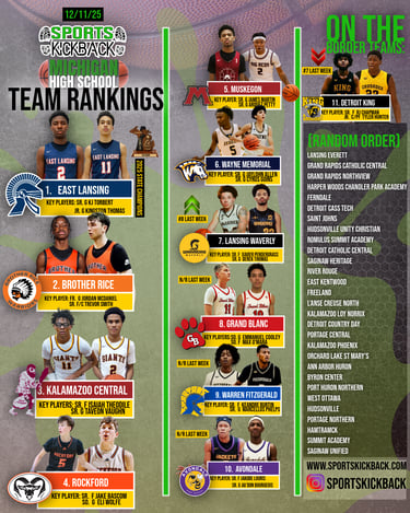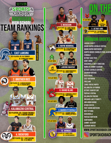Sports Kickback (Week 2) Michigan High School Basketball Team Rankings (12/11/2025). 1. East Lansing 2. Brother Rice 3. Kalamazoo Central 4. Rockford 5. Muskegon 6. Wayne Memorial 7. Lansing Waverly 8. Grand Blanc 9.Warren Fitzgerald 10. Avondale 11. Detroit King.